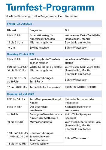 An drei Tagen konnten sich die Teilnehmenden im Alter von sechs bis 15 Jahren auf den Wertwiesen an Mitmachangeboten aktiv betätigen, im Stadtgebiet von Künzelsau an unzähligen Wettkämpfen und Wettbewerben teilnehmen, die Turni-Gala besuchen sowie abends gemeinsam feiern. Dazu kamen mehr als 40 Tanz-Aufführungen auf der Bühne auf den Wertwiesen.