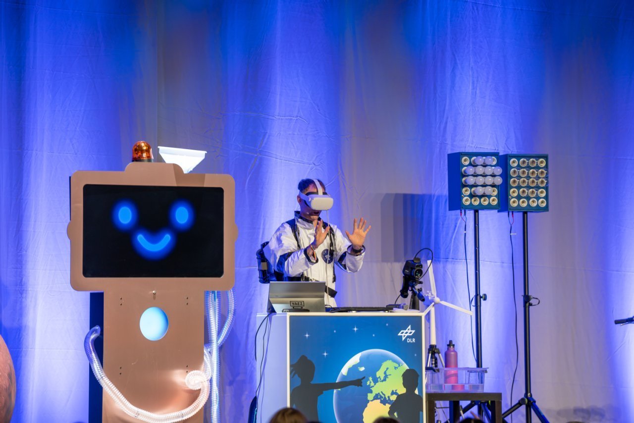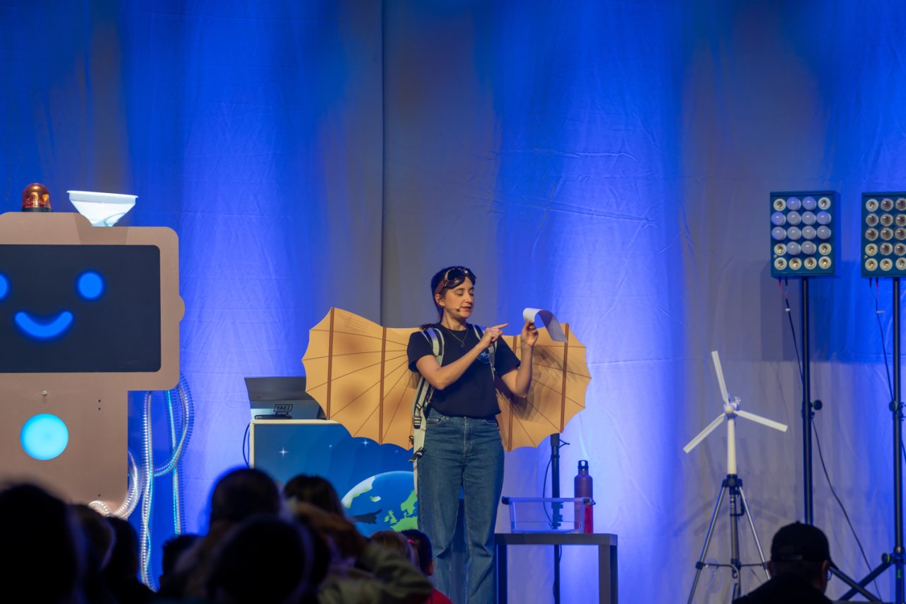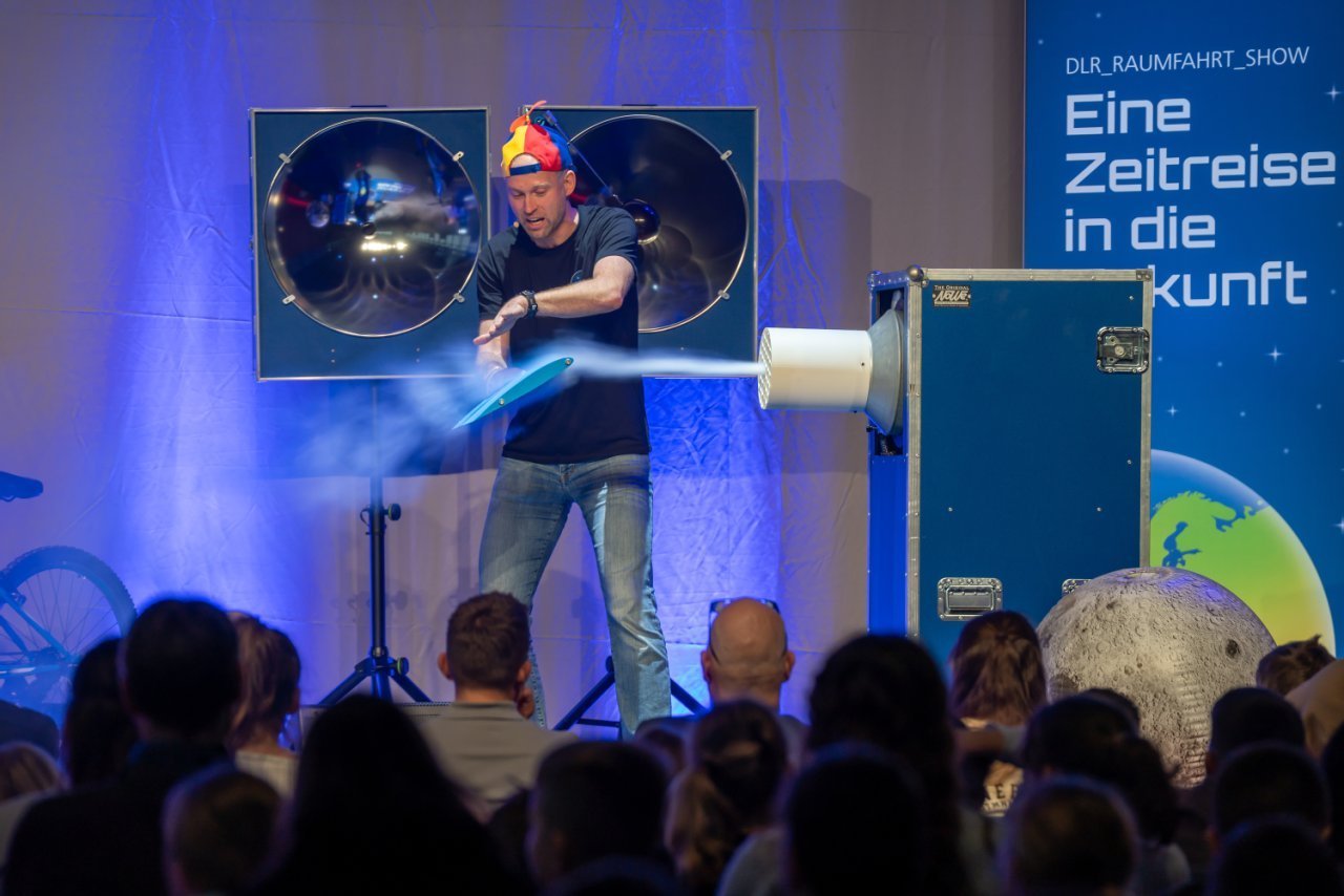 „Ich freue mich, bin aber auch ein bisschen nervös“, so Lina. Die Elfjährige ist mit ihren Klassenkameraden gekommen. Freiwillig hat sich die Sechstklässlerin bereits im Vorfeld gemeldet, um später bei einem Experiment mit auf der Bühne zu stehen. Mehrere Schülerinnen und Schüler werden in die Bühnenshow mit einbezogen, sodass eine ständige Interaktion mit dem Publikum besteht. Mit viel Fingerspitzengefühl vermittelt das DLR-Team Wissen auf niederschwellige Weise und zeigt dabei, wie sehr Forschung Spaß machen kann – und wie wichtig Forschung für die Zukunft ist.