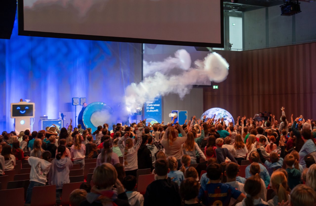 „Tadaaa, hier bin ich“, sagt Moderator Tobi. „Und ich habe meine neue Zeitmaschine Holly mitgebracht“, fährt er fort – eine sensationelle Erfindung, die er in Künzelsau ausprobieren möchte. So wirft er seinen Zettel, auf dem er einen geheimen Wunsch notiert hat, in die Zeitmaschine. Ob er wohl in Erfüllung gehen wird? Da es vor jedem Start in den Weltraum einen Countdown braucht, wird dieser kurzerhand einstudiert. „10 – 9 – 8 –…“hallt es lautstark durch den Saal. Bei „0“ sind die Kinder kaum zu halten. Sie springen auf, stampfen, klatschen in die Hände. „Was für ein Start!“, ruft Moderatorin Sina in die tobende Menge. „Und damit beginnt jetzt unsere Zeitreise in die Zukunft“, sagt sie.
