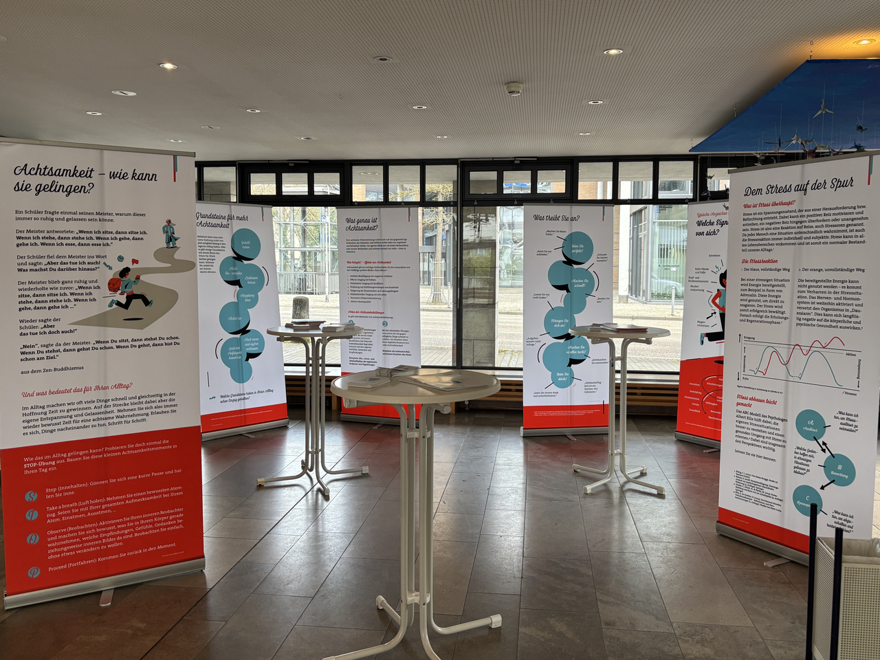 Anschaulich informiert die Ausstellung über typische Stressfaktoren, deren Auswirkungen auf Körper und Psyche sowie über Möglichkeiten, diesen bewusst zu begegnen. Ergänzt wird das Informationsangebot durch konkrete Achtsamkeitsübungen, kurze Impulse und praxisnahe Anregungen zur Stärkung der Resilienz im Alltag.