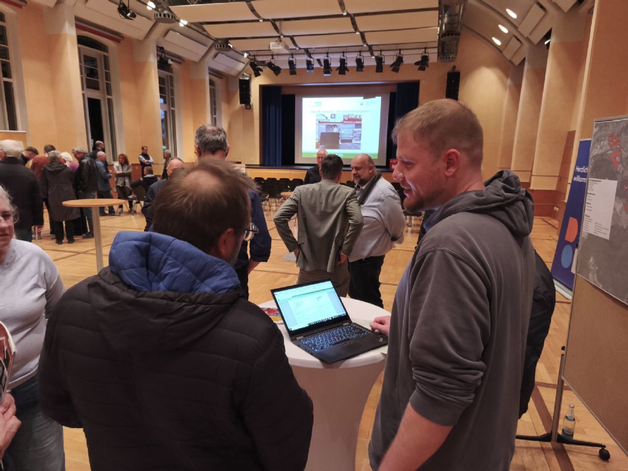 Großes Interesse galt nach den Präsentationen dem Stand der Ingenieurgesellschaft. Anhand der Adresse konnte man feststellen, wer im Bereich eines Wärmenetzprüfgebiets in der Kernstadt Künzelsau wohnt.