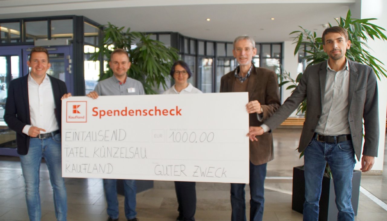 Der Betrieb des Tafelladens in Künzelsau (Miete, Strom, Fahrzeug und mehr) ist finanziell ungefähr zur Hälfte abgedeckt. „Für die andere Hälfte brauchen wir Spenden“, erklärt Kallerhoff. Deshalb ist die Spende in Höhe von tausend Euro, die Leonhard Schlinger von Kaufland Künzelsau überreicht, mehr als willkommen und wird dankend von den Kooperationspartnern angenommen. Das ist der Erlös aus einer Aktion mit Bürgermeister Stefan Neumann und dem Vorsitzenden der Werbegemeinschaft Matthias Uebele. Beide haben an der Kaufland-Kasse um die Wette kassiert. Kaufland hat den Betrag großzügig aufgerundet. Wie andere Einzelhändler unterstützt Kaufland die Tafel aber darüber hinaus auch mit Lebensmitteln, erklärt Anke Braun. Und sie nutzt die Gelegenheit, um auf die personelle Situation im Tafelladen hinzuweisen. Einige langjährige ehrenamtliche Mitarbeiterinnen sind in diesem Jahr altersbedingt ausgeschieden. „Wir brauchen dringend Menschen, die im Tafelladen ehrenamtlich mitarbeiten möchten.“