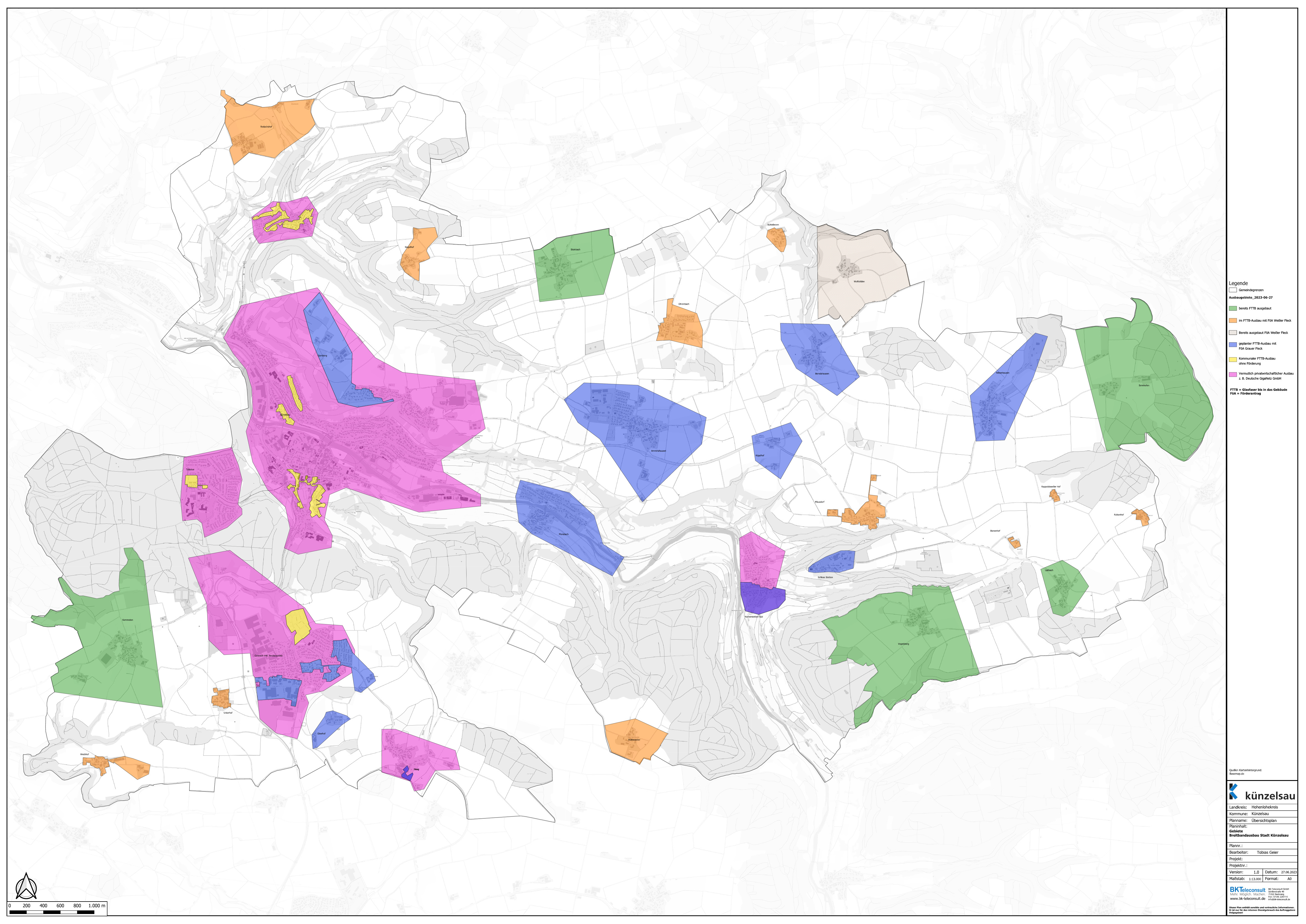 Thomas Siegle und Tobias Geier von BK-Teleconsult informieren über den aktuellen Stand der Planungen und Förderungen der Breitbandversorgung in Künzelsau und den Stadtteilen. In Kemmeten, Steinbach, Sonnhofen, Vogelsberg, Laßbach und Wolfsölden besteht bereits ein Breitbandnetz. Die Baumaßnahmen wurden von den städtischen KünWerken ausgeschrieben und begleitet. Bis 2028 ist die Versorgung von weiteren Stadtteilen, für die es Bundes- und Landesförderung gibt, geplant: Rodachshof, Siegelhof, Büttelbronn, Ohrenbach, Rappoldsweilerhof, Falkenhof, Bienenhof, Mäusdorf, Etzlinsweiler, Unterhof, Weckhof, Seeleswald, Garnberg, Gaisbach-Ost, Oberhof, Morsbach, Amrichshausen, Berndshausen, Kügelhof, Kocherstetten-Süd, Schloß Stetten, Nitzenhausen und Haag. Dank der Förderzusagen können diese „Grauen“ und „Weißen Flecken“ mit Glasfaserinfrastruktur erschlossen werden. Die Bundesförderung beträgt 50 Prozent, die des Landes zusätzlich 40 Prozent, sodass für die Stadtverwaltung ein Eigenanteil von zehn Prozent der Gesamtkosten bleibt. Der Eigenanteil der KünWerke liegt dennoch geschätzt bei beachtlichen rund 1,8 Millionen Euro. Damit werden die Glasfaseranschlüsse für zirka 1.650 Gebäude geschaffen.
