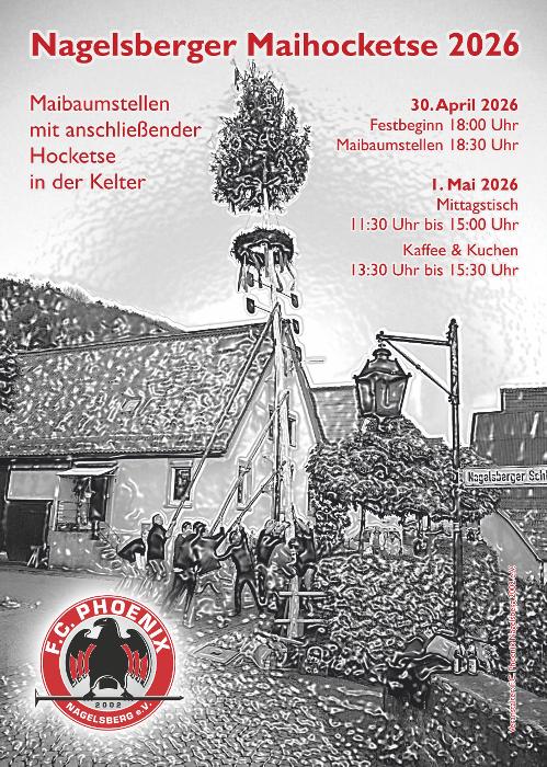 Das Maifest beginnt am Donnerstag, 30. April um 18.00 Uhr bevor um 18:30 Uhr traditionell der Maibaum gestellt wird. Anschließend lädt die Kelter und der Keltervorplatz zum gemütlichen Beisammensein ein. Für das leibliche wohl ist gesorgt. Bei schlechtem Wetter bietet die Kelter ausreichend Platz im Trockenen. Am Freitag 1. Mai werden von 11.30-15 Uhr verschiedene Mittagessen, und von 13.30-15.30 Uhr Kaffee und Kuchen angeboten. Der FC Phoenix Nagelsberg freut sich auf Ihren Besuch. Wanderer und Radler sind herzlich Willkommen
