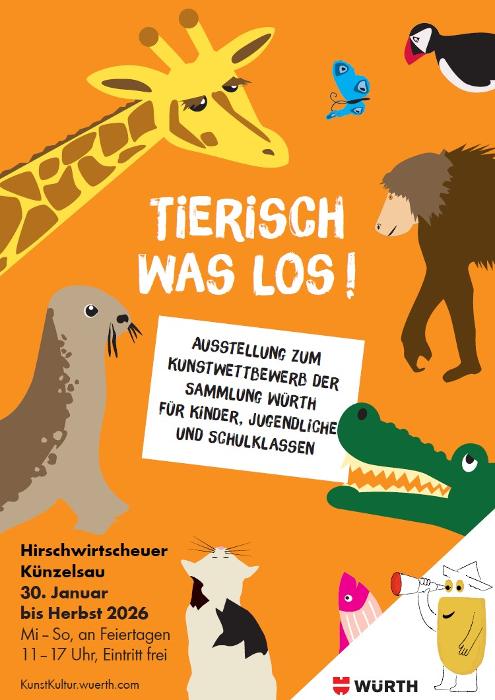 Von Affe bis Giraffe: In der Hirschwirtscheuer in Künzelsau ist „Tierisch was los!“. Inspiriert von sechs tierischen Kunstwerken der Sammlung Würth und mit großer Kreativität haben rund 1000 Kinder und Jugendliche aus Baden-Württemberg an dem Kunstwettbewerb der Sammlung teilgenommen. Gemeinsam entdecken wir die vielen unterschiedlichen Tierdarstellungen in der Hirschwirtscheuer. Macht mit bei unserer wilden Kunstsafari! Dieses Führungsformat richtet sich an große und kleine Besuchende. Dauer: 30 Minuten Teilnahmegebühr: 3 Euro pro Person, 6 Euro als Familie (bis zu 5 Personen) Anmeldung unter www.KunstKultur.wuerth.com