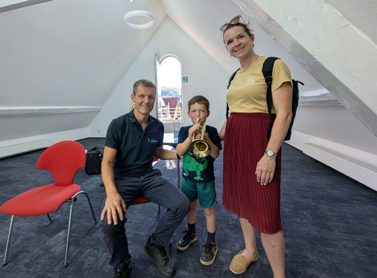 Paul erwies sich auf Anhieb als talentiert, was auch Bender Respekt abforderte. Beim ersten Blasversuch kam auch schon ein vernünftiger Ton heraus. Das fand auch die Mutter beeindruckend, „vor allem, wenn man noch kein Instrument in der Familie hat außer einem Kinderxylophon und einer Kinderharmonika“. Paul nutzte die Gelegenheit, mehr auszuprobieren, zum Beispiel Blockflöte. Florina Bob freut sich, dass sich Tochter Sofia an der Klarinette ausprobieren kann. Die beiden stammen aus Landshut und haben den Besuch bei einer Freundin in Dörrenzimmern zum Ausflug nach Künzelsau genutzt. Die Mutter ist beeindruckt von dem musikalischen Angebot.